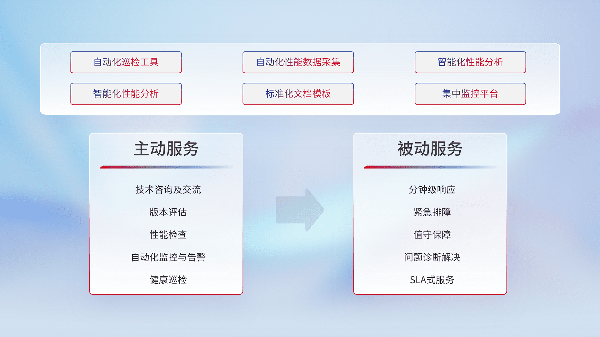 智能化工具和标准化文档,,保障服务质量,,,提供主动服务(包含技术咨询、、版本评估、、、性能检查、、、、自动化监控与告警、、、、健康巡检)和被动服务包含(分钟级响应、、、紧急排障、、、、值守保障、、、问题诊断解决、、、SLA服务)。。